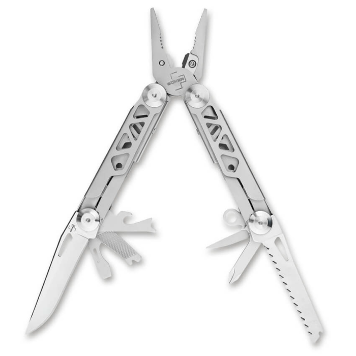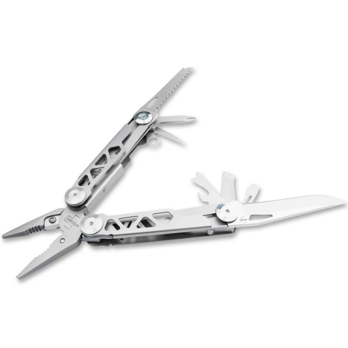 A Böker Plus Specialist Pro é uma ferramenta multi-função práctica, vem equipada com uma lâmina, uma serra para madeiras, abre-latas, abre-caricas, alicate para cortar cabos, furador de costura, chave de parafusos da Philips, chave de fenda e uma lima de metais. Com a compra vem acompanhado uma bolsa de nylon.